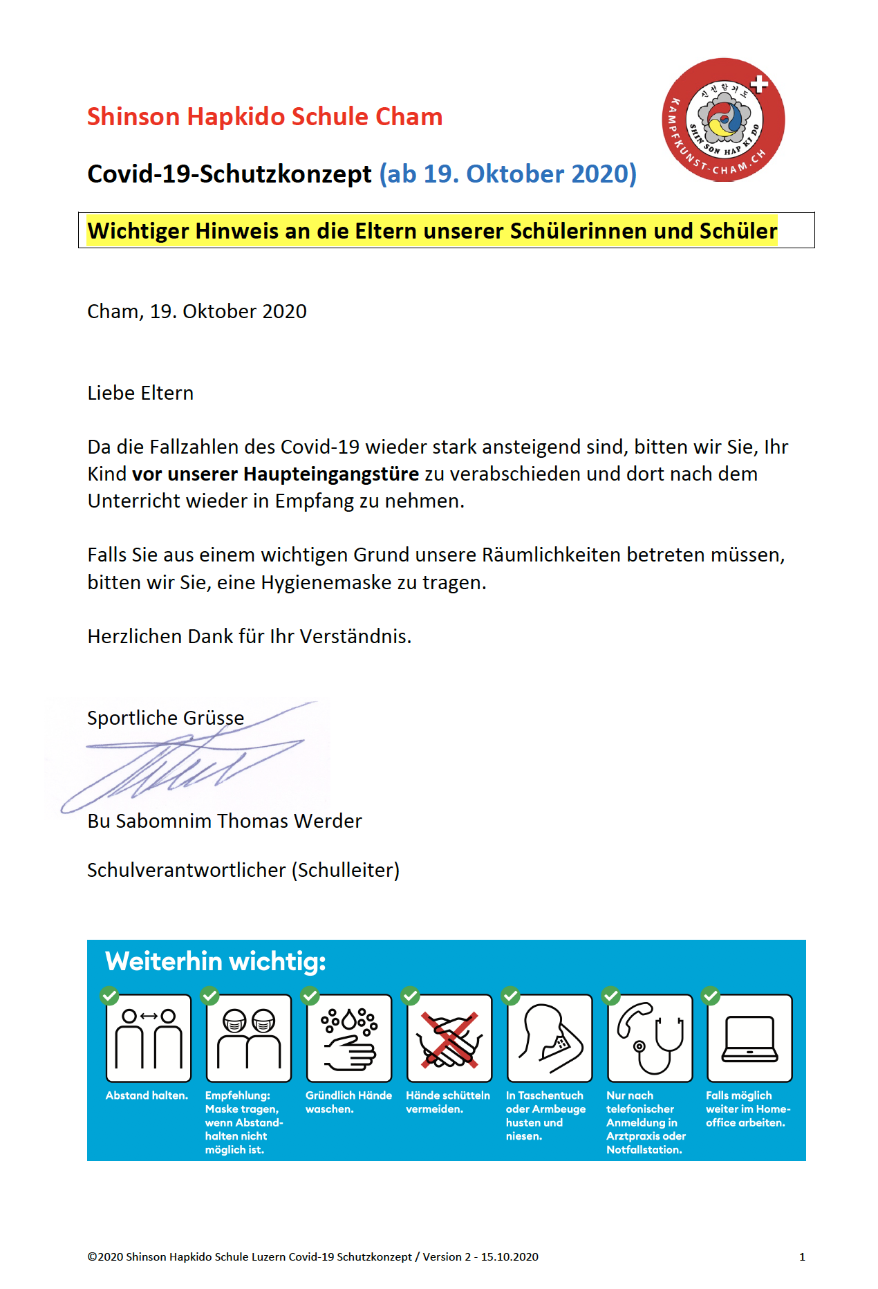 Ab Donnerstag 29. Okt. 2020 Unterrichten und trainieren wir das Shinson Hapkido Programm kontaktlos und mit Abstand, (1.5 Meter) und bis maximal 15 Personen. Ab 16 Jahren tragen alle eine Schutzmaske, auch während des Unterrichts. Von den Regeln ausgenommen sind Kinder unter 16 Jahren. |