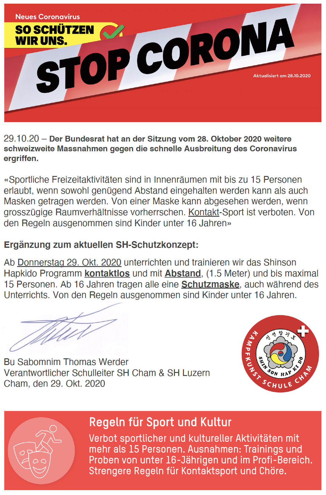 15.10.20 - Ergänzung zum Schutzkonzept ab Montag 19. Okt. 2020.