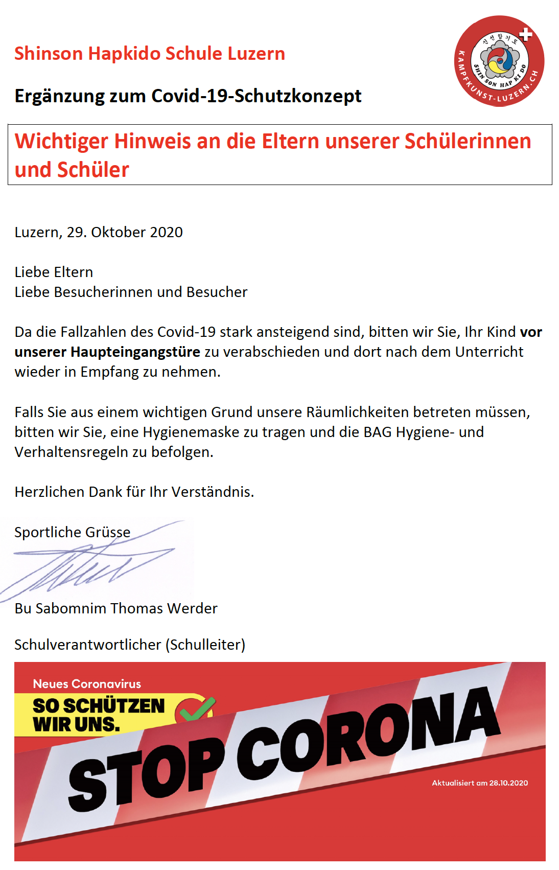 29.10.20 - Wichtiger Hinweis an die Eltern und BesucherInnen unserer SchülerInnen. (Ergänzung zum Schutzkonzept ab 29. Okt. 2020) |