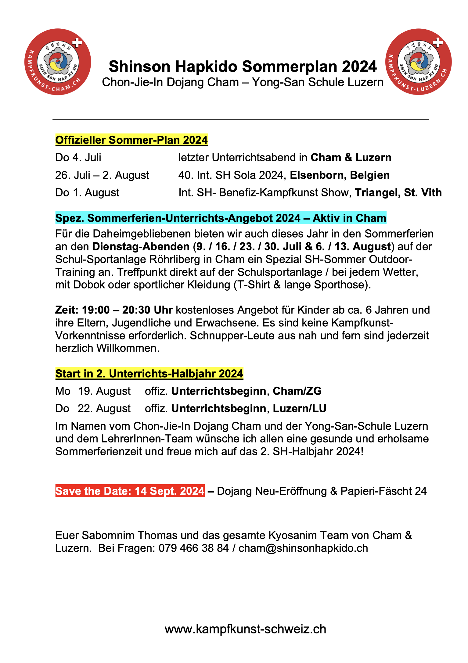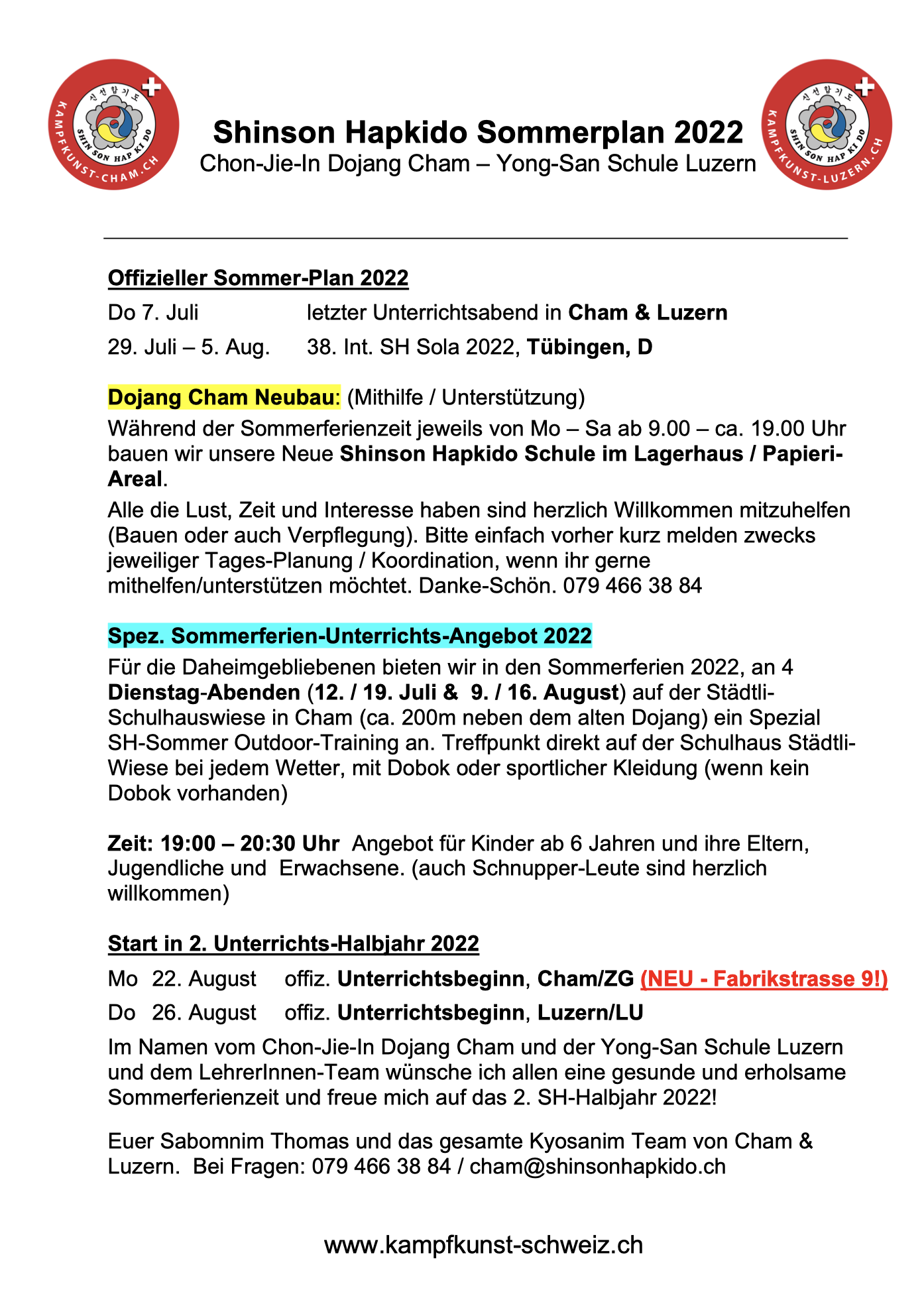 4.7.22 - Sommerplan von der Shinson Hapkido Schule Cham und Luzern.