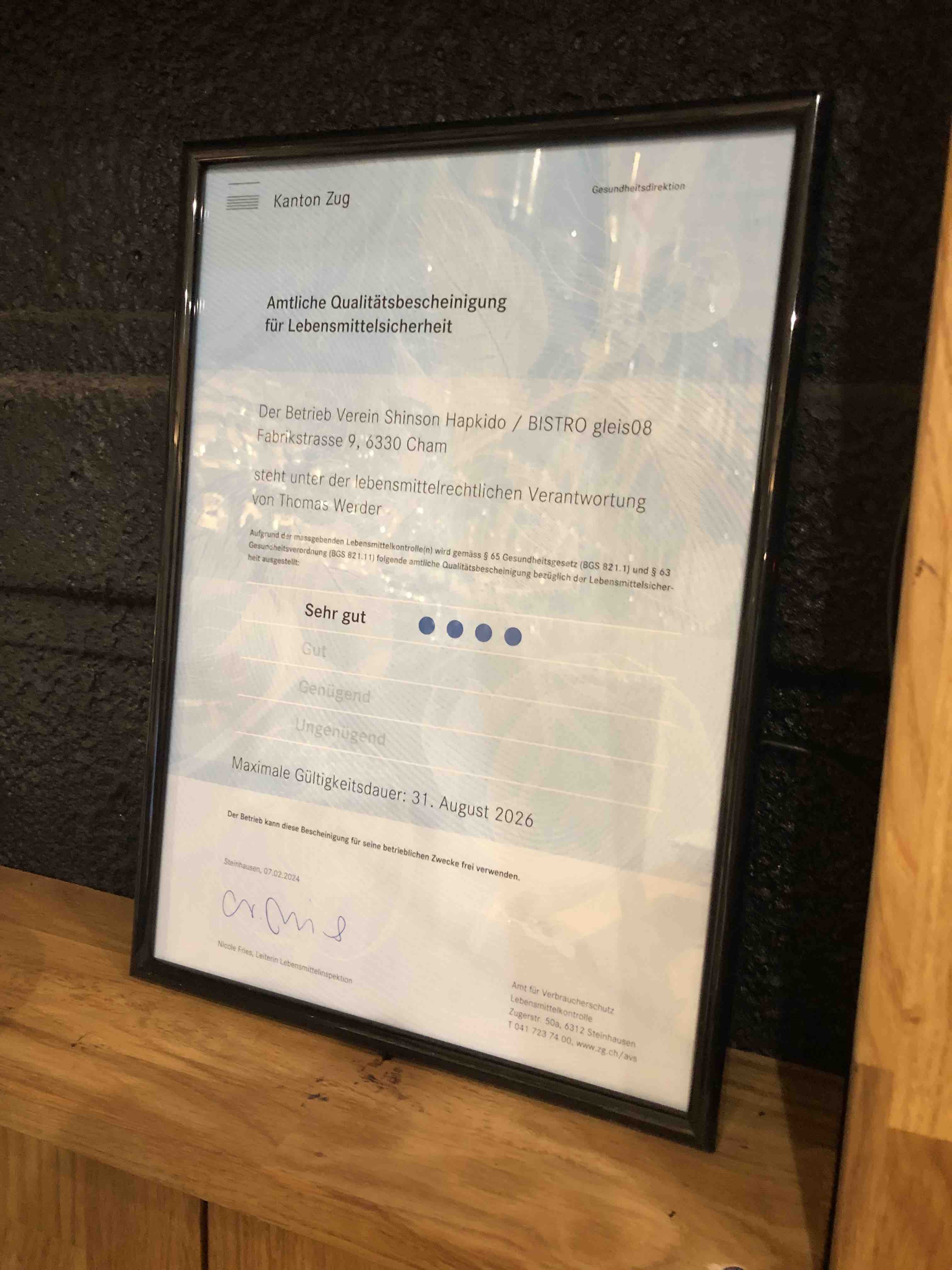 Unser öffentliches Vereins BISTRO gleis08 erhält von der Zuger Gesundheitsdirketion die Qualitätsbescheinigung: SEHR GUT!