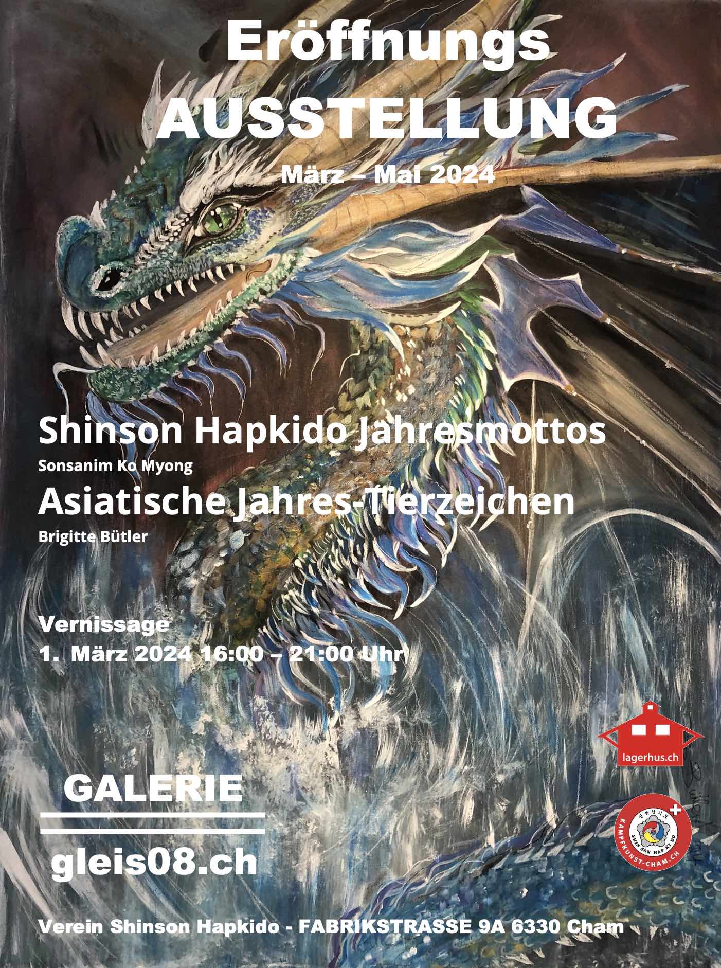Mit der GALERIE gleis08 Eröffnung am 1. März 2024 werden nun erstmals alle von Brigitte Bütler gemalten Jahres-Motto-Bilder in Verbindung mit den von Sonsanim Ko Myong verfassten Shinson Hapkido Jahresmottos, gemeinsam mit dieser 1. Ausstellung auch der Öffentlichkeit präsentiert. |