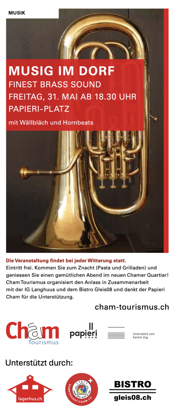 Kommen Sie zum Znacht (Pasta und Grilladen) und geniessen Sie einen gemütlichen Abend im neuen Chamer Quartier! Cham Tourismus organisiert den Anlass in Zusammenarbeit mit der IG Langhuus und dem Verein Shinson Hapkido, Lagerhus.ch & BISTRO gleis08.ch und dankt der Papieri Cham für die Unterstützung.