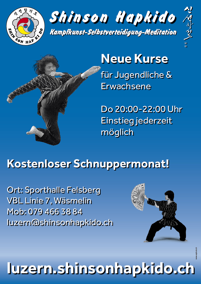 INFO-Flyer Jetzt kostenloser und unverbindlicher Probemonat in der Shinson Hapkido Schule Luzern für Kinder, Jugendliche und Erwachsene nutzen. Kontakt unter: luzern@shinsonhapkido.ch oder Mob. +41 79 466 38 84 |
