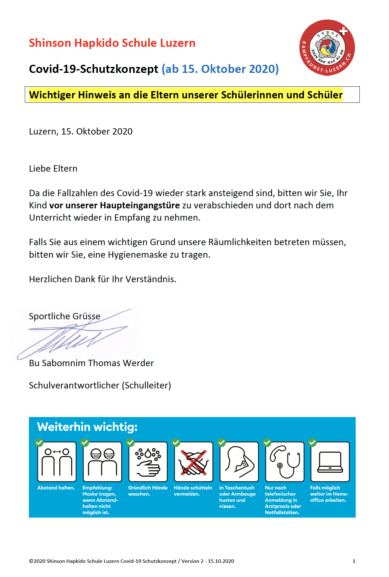 15.10.20 - Ergänzung zum Schutzkonzept ab 15. Okt. 2020. Wichtiger Hinweis an die Eltern und BesucherInnen unserer SchülerInnen. |