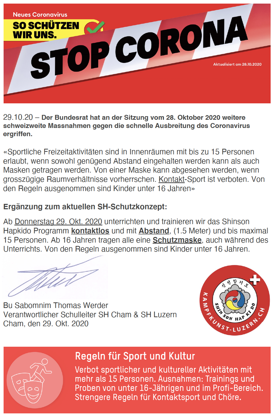 Ergänzung zum aktuellen SH-Schutzkonzept: Ab Donnerstag 29. Okt. 2020 Unterrichten und trainieren wir das Shinson Hapkido Programm kontaktlos und mit Abstand, (1.5 Meter) und bis maximal 15 Personen. Ab 16 Jahren tragen alle eine Schutzmaske, auch während des Unterrichts. Von den Regeln ausgenommen sind Kinder unter 16 Jahren. |