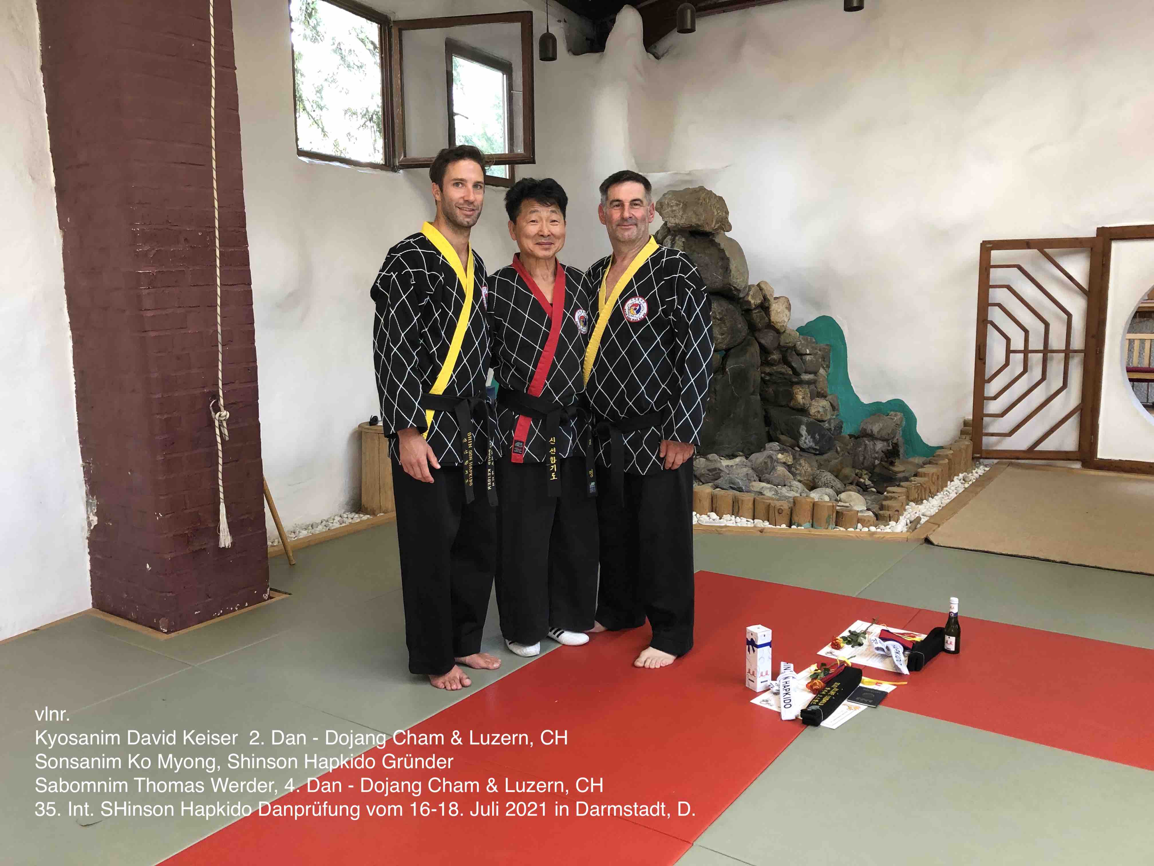 Herzliche Gratulation an Kyosanim David Keiser (2. Dan) und Sabomnim Thomas Werder (4. Dan) zur bestandenen Shinson Hapkido Danprüfung im 2021, anlässlich der praktischen 35. Int. Danprüfung vom 16.-18. Juli 2021 in Darmstadt, D. |