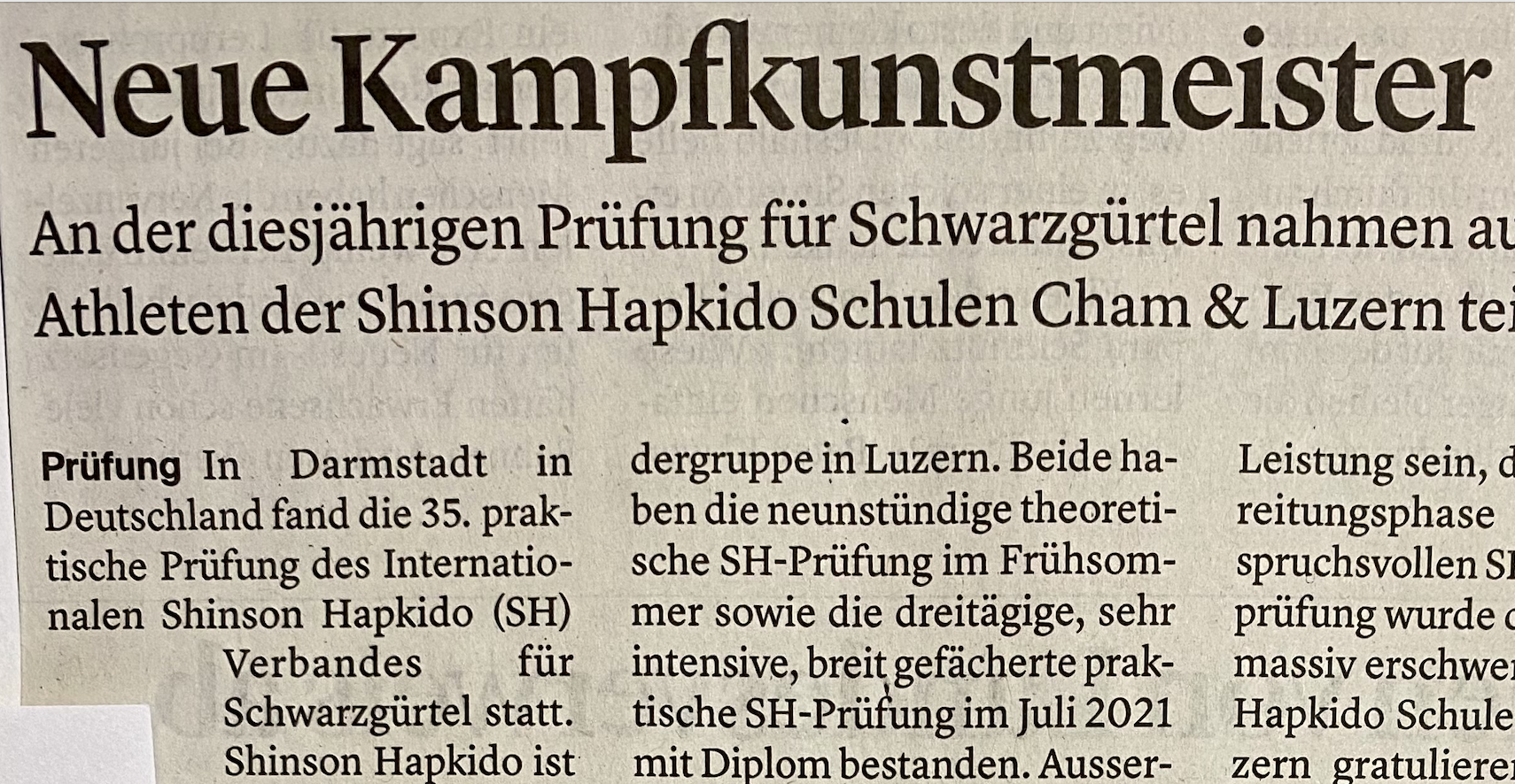 29.9.21 - Bericht Zuger Zeitung "Neue Kampfkunstmeister" Ausgabe: 226 - Thema int. SH Danprüfung 2021 |